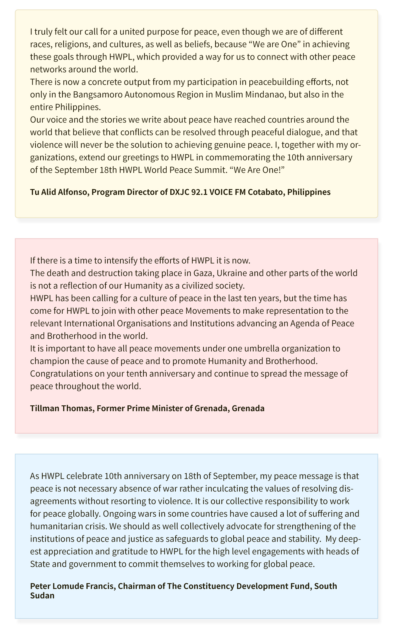 Since 2014, peace advocates from around the world who have been working with HWPL for over 10 years have sent more than 10,000 peace messages from 158 countries to celebrate the 10th anniversary of the World Peace Summit. We’re sharing some of them with the peace family,